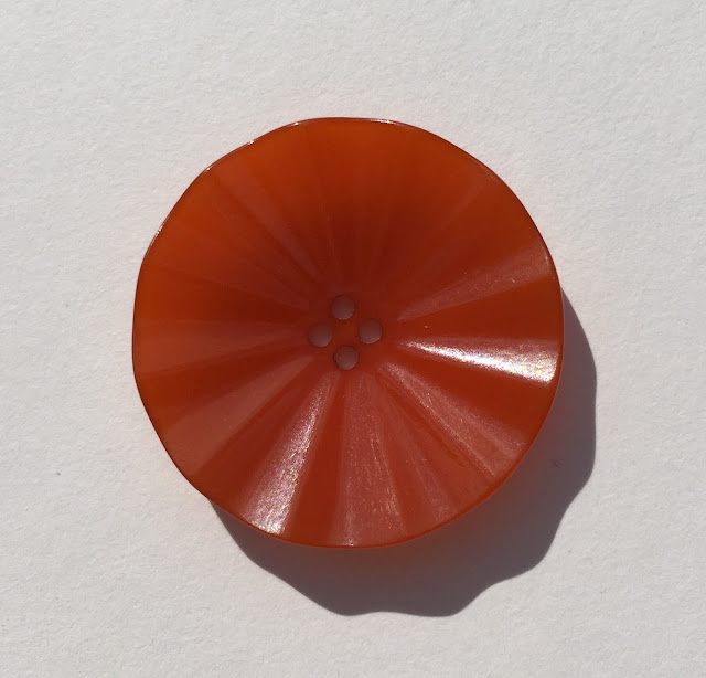 It's October now and I'm paying homage to this month with an orange button that's ridged with an all-the-way-around, wavy pattern and centered with four holes. In the production phase of this old button, the plastic was pressed or stamped by factory tools as opposed to being carved or sculpted. To that end, this button did test postive for Bakelite. It's not too substantial, but this nifty keeper has loads of charm.